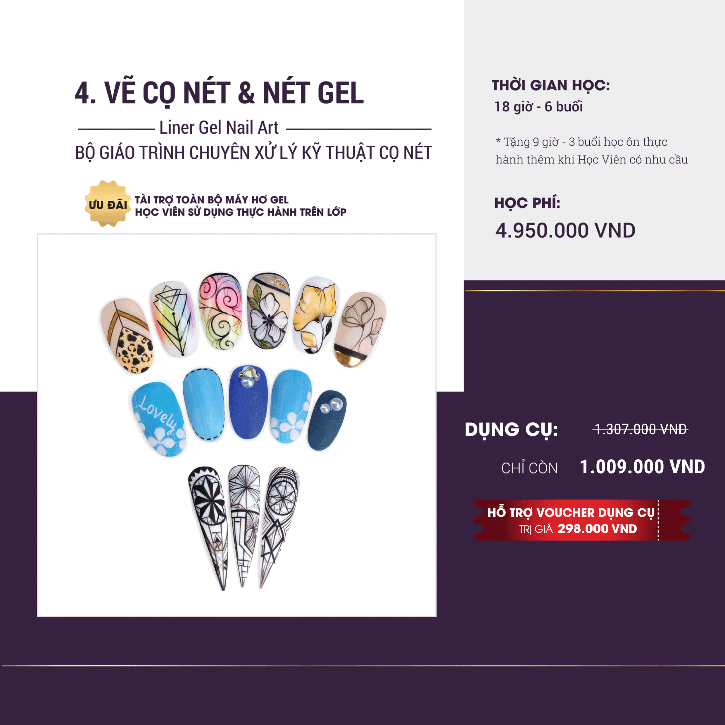 - Cập nhật những kĩ năng Vẽ trendy, cực xịn từ kĩ thuật Vẽ cọ nét, cọ nét gel “thần thánh”, loại cọ chiến lược của giới làm Nail Việt Nam, được giới thợ Nail chuyên nghiệp ưa chuộng xài nhất vì vẽ rất đẹp và hiện đại tiện dụng với những Hiệu Ứng Vẽ Gel từ Sơn Gel, Màu Bản Gel đầy đủ các loại cọ tán gel, ẩn gel… Và trang bị luôn kiến thức Vẽ Nổi 3D cao cấp rất sang và Tây, style thịnh hành hiện nay.